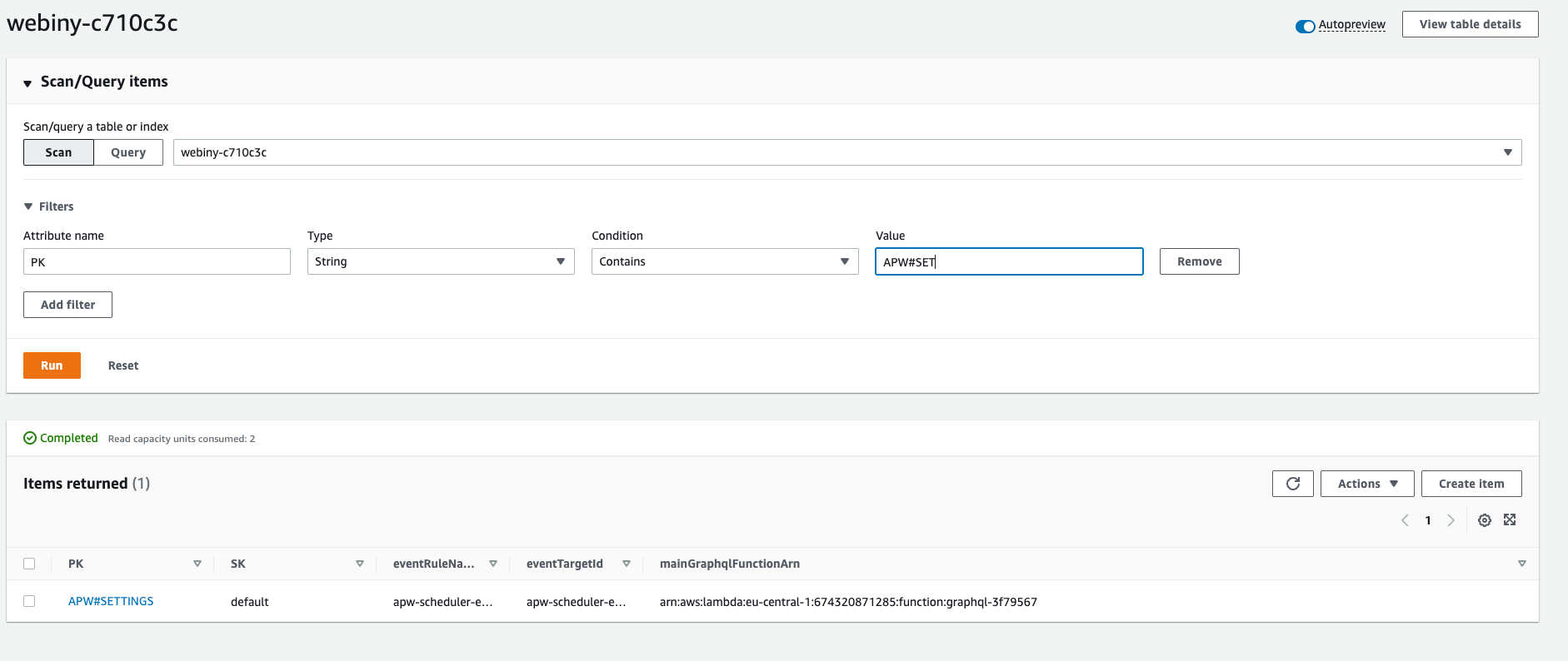 So, in order to fix the issue, we’ll have to go into our AWS console, find the relevant DynamoDB table, and manually delete the record shown in the above screenshot (APW#SETTINGS). Note that if you don’t have the record in the table, there’s nothing to do then.